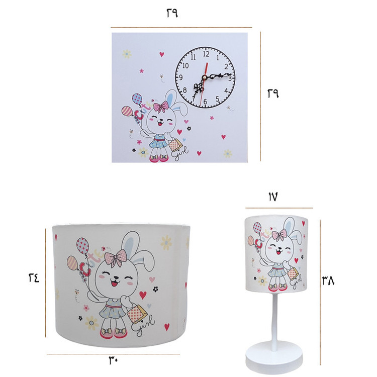 ست اکسسوری اتاق کودک طرح خرگوش شامل لوستر ، آباژور و ساعت دیواری می باشد . جنس سازه فلز و شید آن از طلق و مخمل با رنگ ثابت می باشد . بهتر است بدانید شید های پارچه ای انتشار دهنده نوری گرم و درخشان تری هستند و حتی در حالت خاموش هم می توانند به فضا گرمای بیشتری انتقال دهند. جنس بدنه ساعت دیواری MDF با چاپ استکیر ضد آب ( قابل تمیز کردن با پارچه نمدار) بهمراه موتور آرام گرد 6363 کم مصرف می باشد که در کنار ست لوستر و آباژور محیط دلنشینی را برای اتاق کودک دلبندتان فراهم می کند.