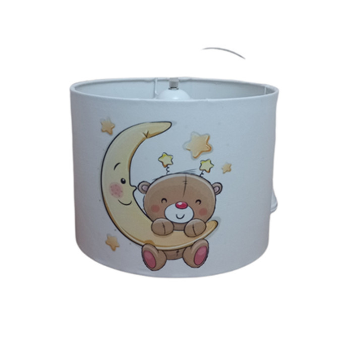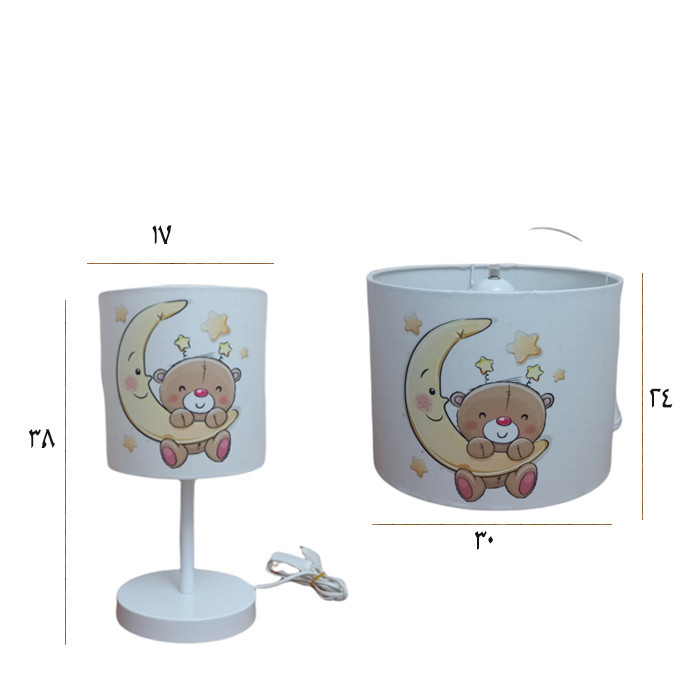 ست اکسسوری اتاق کودک طرح خرس و ماه شامل لوستر ، آباژور می باشد . سازه محصول از جنس فلز با رنگ کوره ای مقاوم و شید ها از مخمل با رنگ ثابت و طلق می باشند . بهتر است بدانید شید های پارچه ای انتشار دهنده نوری گرم تر و درخشان تری هستند و حتی در حالت خاموش هم می توانند به فضای اتاق گرمای بیشتری انتقال دهند و محیط دلنشینی را برای اتاق کودک دلبندتان فراهم کنند.