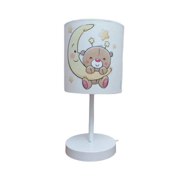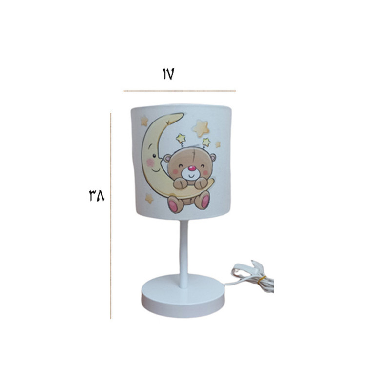 ست اکسسوری اتاق کودک طرح پرطرفدار خرس و ماه شامل لوستر ، آباژور و ساعت دیواری می باشد که با توجه به درخواست شما و نیاز مشتریان بصورت تک آباژور هم ارائه شد . جنس سازه آباژور از فلز و شید آن از طلق نسوز ضخیم و مخمل با رنگ ثابت و کیفیت چاپ عالی می باشد . بهتر است بدانید شید های پارچه ای انتشار دهنده نوری گرم و درخشان تری هستند و حتی در حالت خاموش هم می توانند به فضا اتاق گرمای بیشتری انتقال داده و محیط دلنشینی را برای اتاق کودک دلبندتان فراهم کند.