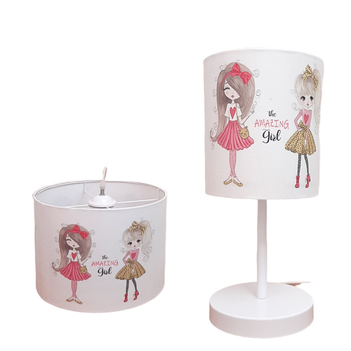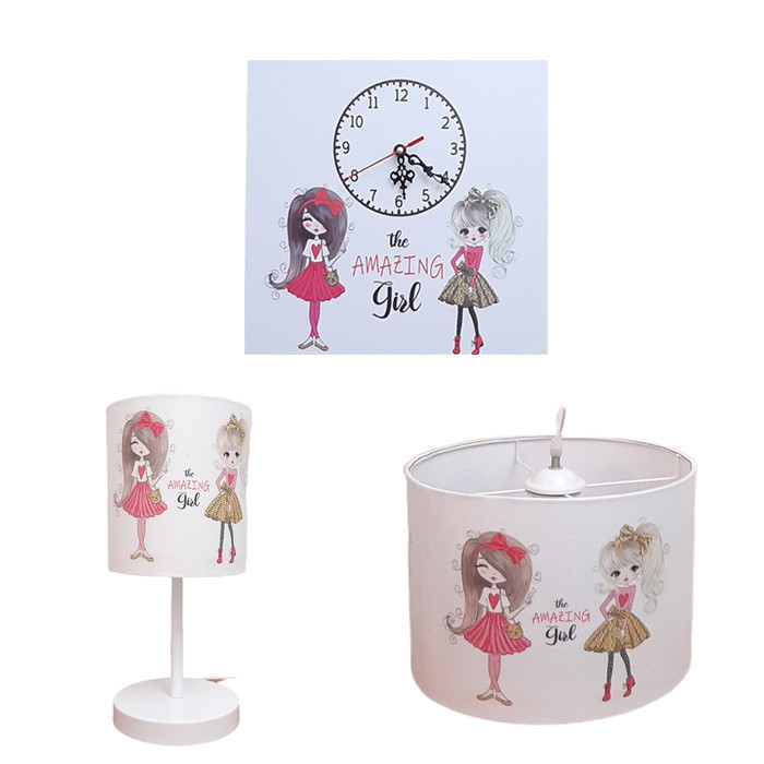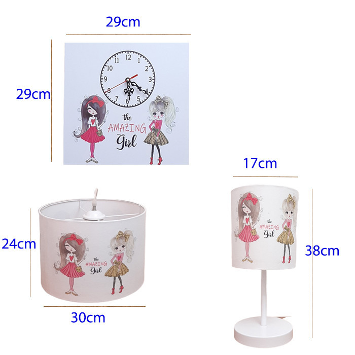 ست اکسسوری اتاق کودک طرح دخترانه شامل لوستر ، آباژور و ساعت دیواری می باشد . جنس سازه محصول فلز و شید آن از طلق و مخمل با رنگ ثابت می باشد . بهتر است بدانید شید های پارچه ای انتشار دهنده نوری گرم و درخشان تری هستند و حتی در حالت خاموش هم می توانند به فضا گرمای بیشتری انتقال دهند. جنس بدنه ساعت دیواری MDF با چاپ استکیر ضد آب ( قابل تمیز کردن با پارچه نمدار) بهمراه موتور آرام گرد 6363 کم مصرف می باشد که در کنار ست لوستر و آباژور محیط دلنشینی را برای اتاق کودک دلبندتان فراهم می کند.