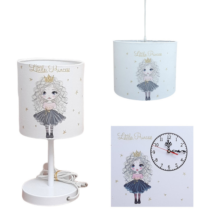ست اکسسوری اتاق کودک طرح دختر موفرفری شامل لوستر ، آباژور و ساعت دیواری می باشد . جنس به کار رفته در لوستر و آباژور ، پایه فلز و شید ها از جنس مخمل با رنگ ثابت می باشد. بهتر است بدانید شید های پارچه ای انتشار دهنده نوری گرم تر و درخشان تری هستند و حتی در حالت خاموش هم می توانند به فضا، گرمای بیشتری انتقال دهند. جنس بدنه ساعت دیواری MDF با چاپ استکیر ضد آب بهمراه موتور آرام گرد کم مصرف می باشد که در کنار ست لوستر و آباژور محیط دلنشینی را برای اتاق کودک دلبندتان فراهم می کند